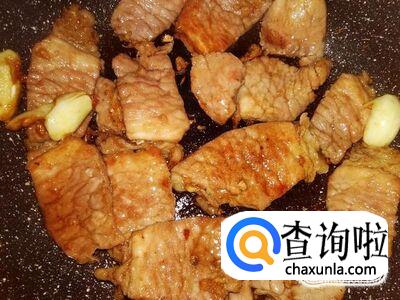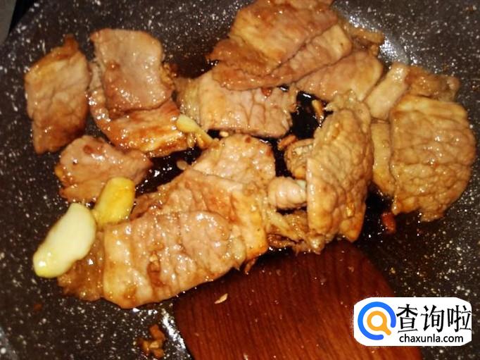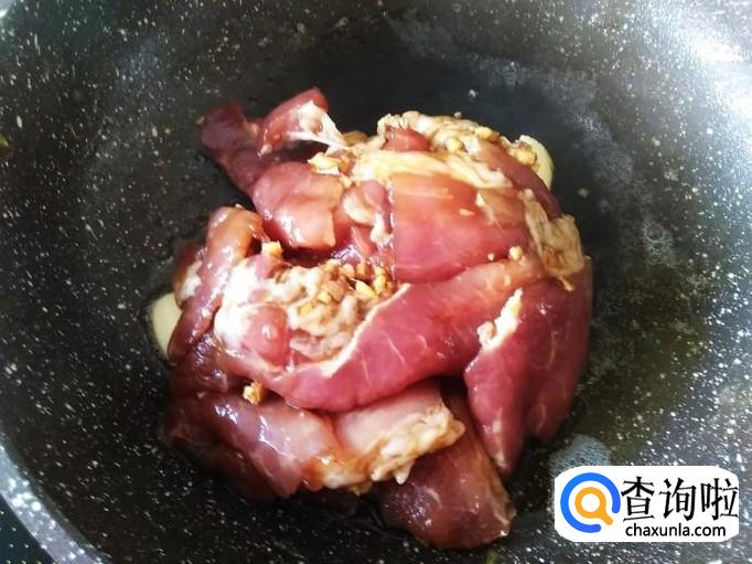 再开火下油,放蒜米爆香,然后把腌制好的瘦肉放下锅。