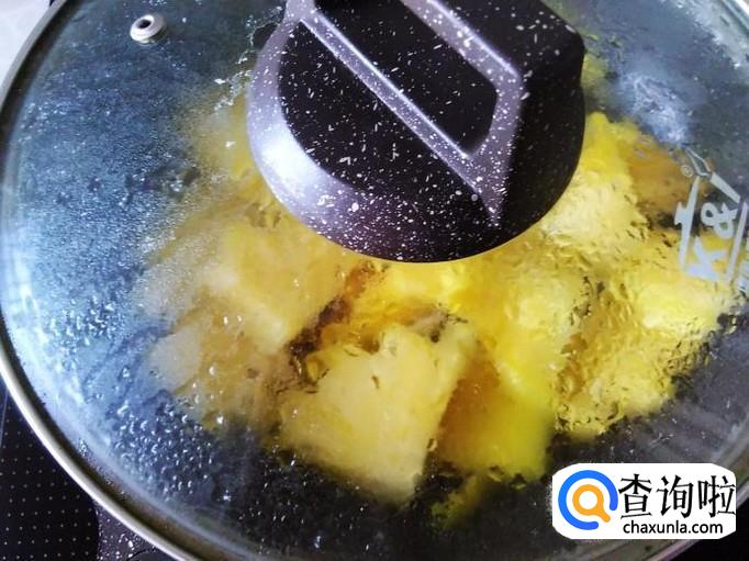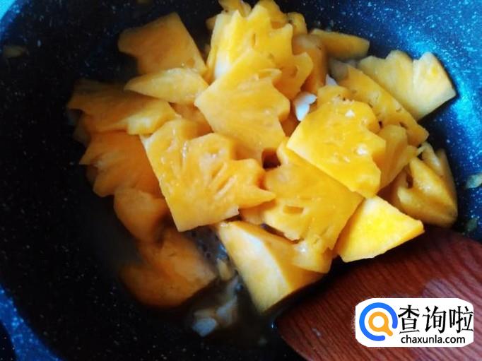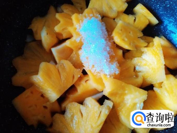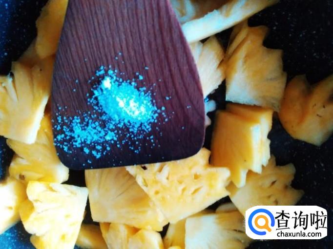 菠萝下锅,加适量的盐翻炒一下,盖上盖子小火焗1分钟左右。
