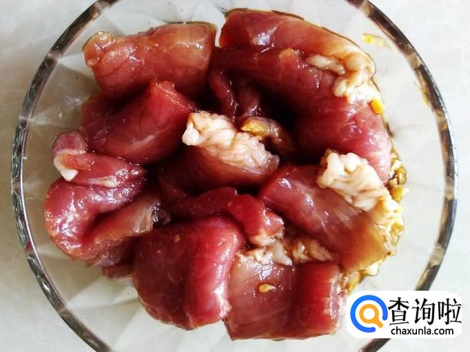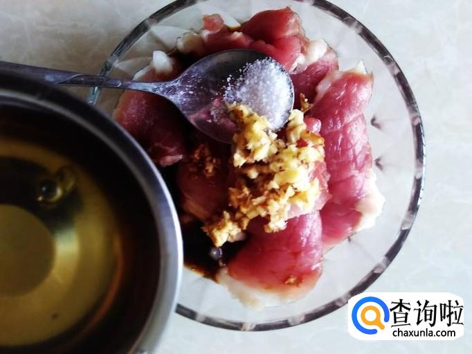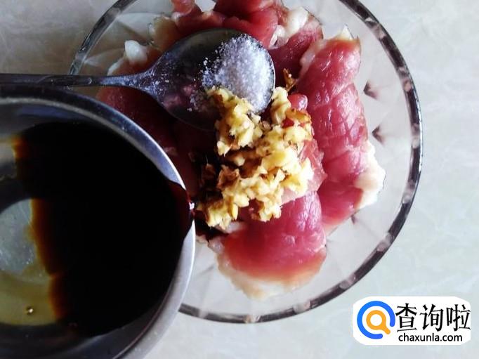 瘦肉里加适量的盐,姜蓉、1勺生抽、1勺料酒腌制几分钟。