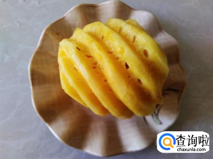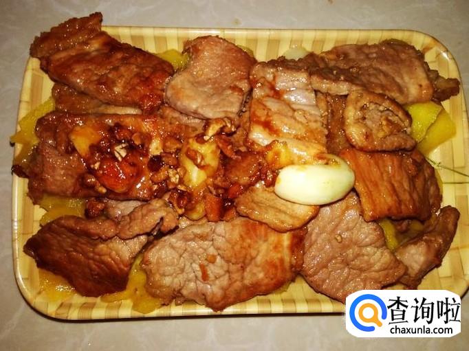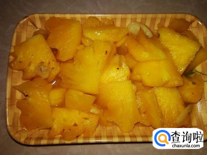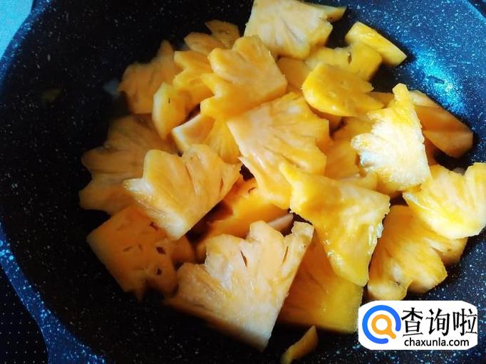 大火翻炒炸煎3分钟左右,煎到肉片变成焦黄色就可以了,然后铲铺到菠萝面上就完成了。