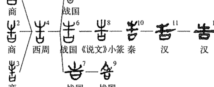 告字最初见于商朝甲骨文中,甲骨文上面部分就像是一个牛头,下面是一个盛放牛头的器皿,整体看起来就像是把牛头放到器皿中进行祭祀。金文和篆体大体与甲骨文字型相同。隶变后,楷书逐渐演变为“告”。