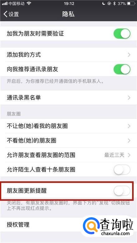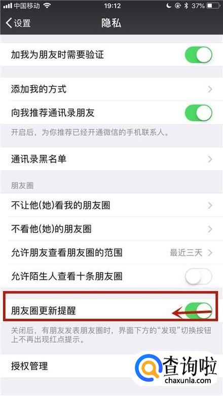接着点击关闭朋友圈更新提醒开关,如下图所示。