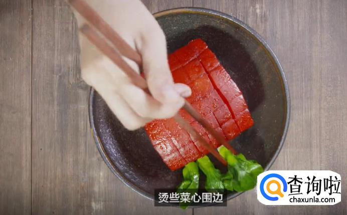 出锅后,将碗里的汤汁控出,再将肉倒扣入盘,将烫好的菜心放一些在周边。