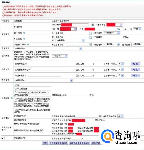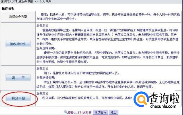 然后选择“深圳市人才引进业务申报”,然后再选择“个人测评”,选择完成后,再点击“积分申报”链接。点击进去后,按照提示完成积分申报工作。