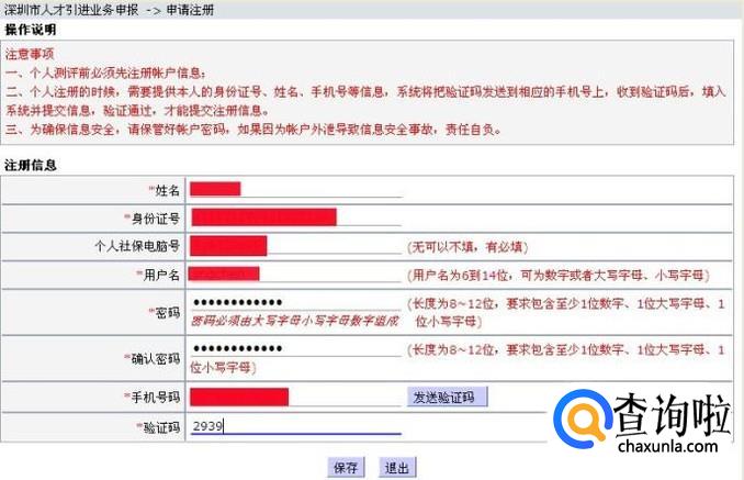 根据一系列提示,填写个人的身份证信息、社保电脑号、姓名、手机号码等相关信息,并且通过手机号码获得四位的验证码。完成这一系列信息的填报后,弹出提示框,表示注册成功。