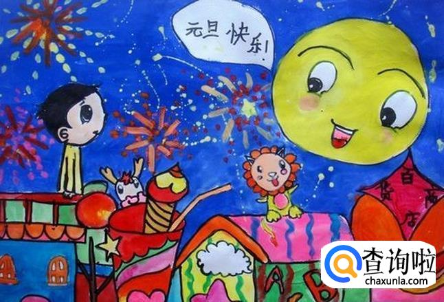 元旦晚上,大家都开开心心地放着烟花和炮竹,月亮也笑开颜,小朋友们坐在屋顶感受这美好的世界。