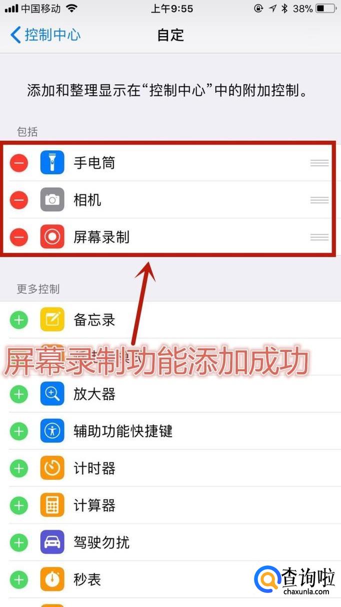 控制中心中的屏幕录制功能添加成功,如下图所示。