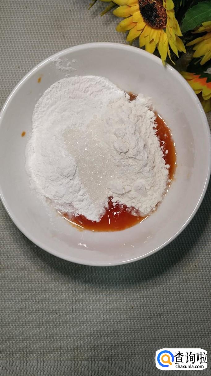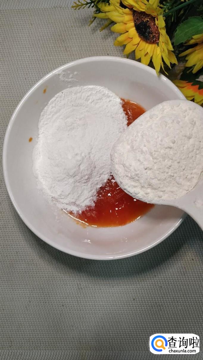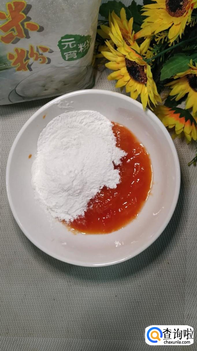 按照1:1的比例,加入适量糯米粉和面粉,再加入一勺白砂糖。注意,这个比例做出来的柿子饼口感比较好,白砂糖可以增加甜味。