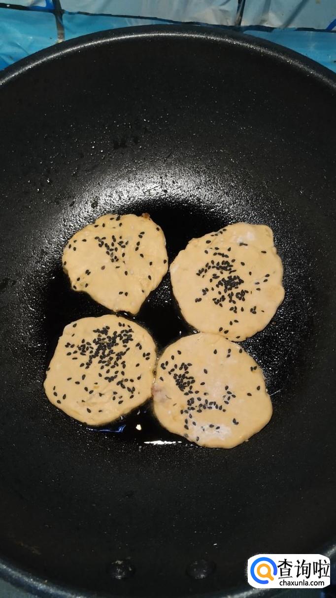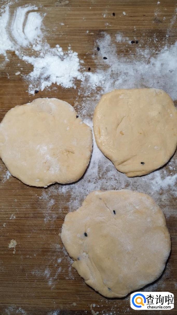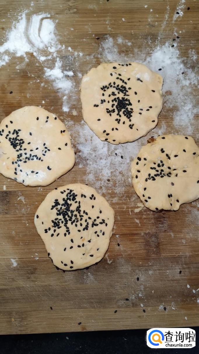 用手按扁,用擀面杖稍微擀一下,然后粘上黑白芝麻,备用。