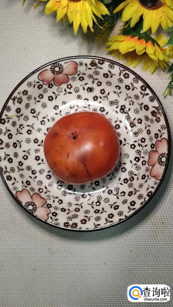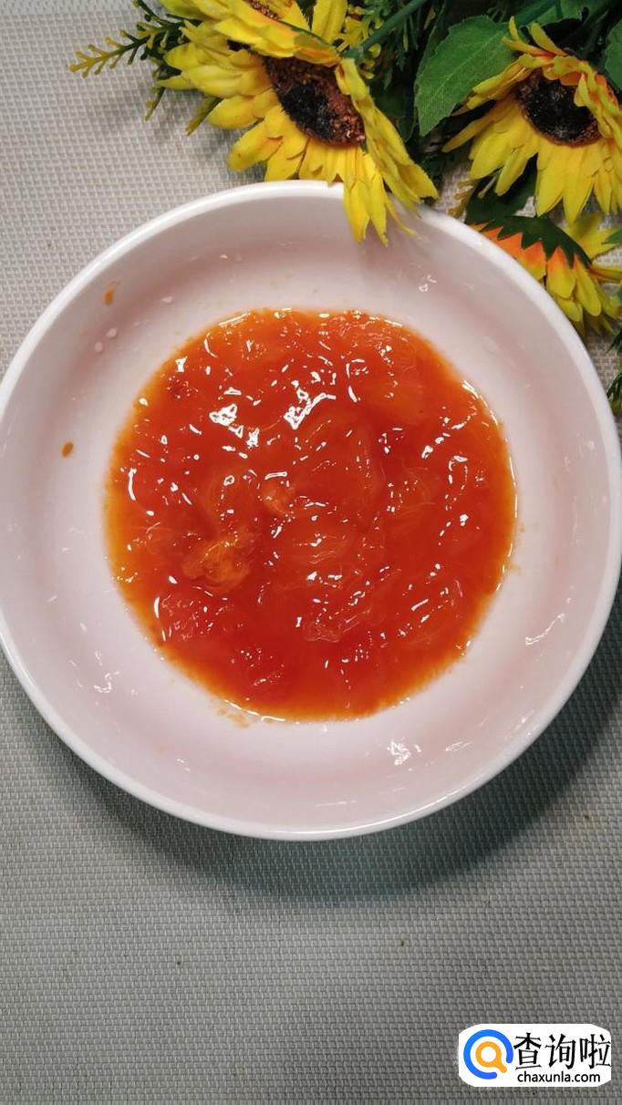 准备一个熟透的柿子,将柿子去除外皮,将果肉挤入碗中备用。注意,这里选用的是空柿。