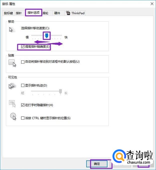 弹出的界面,我们点击指针选项,然后我们将选择指针移动速度的滑动按钮向左或者向右滑动调整一下 ,当我们发现光标没有移动后,就不会调整了,之后我们勾选上提高指针精确度,然后我们点击应用,之后点击确定,这样光标就不会自己移动了。