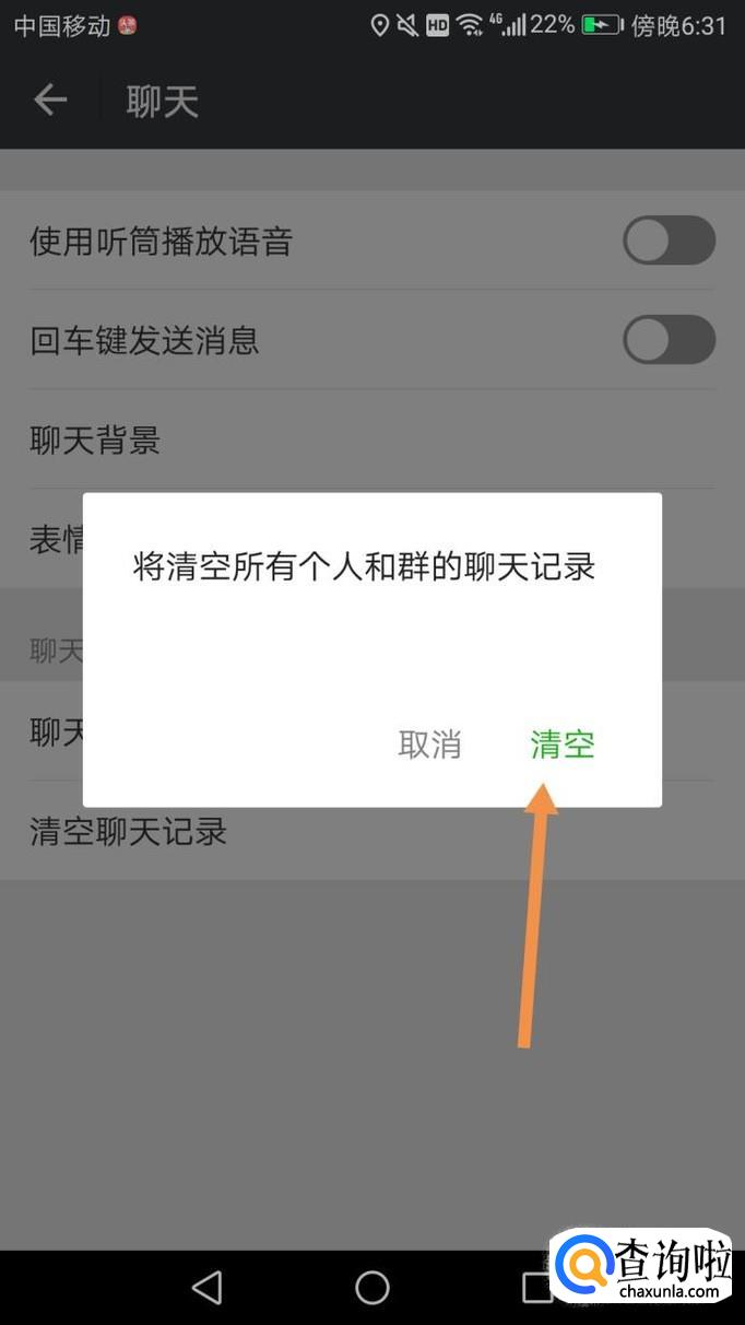 点击清空聊天记录后,会显示让你做出选择,这是选择确定,就可以删除所有的微信聊天记录了,如下图。