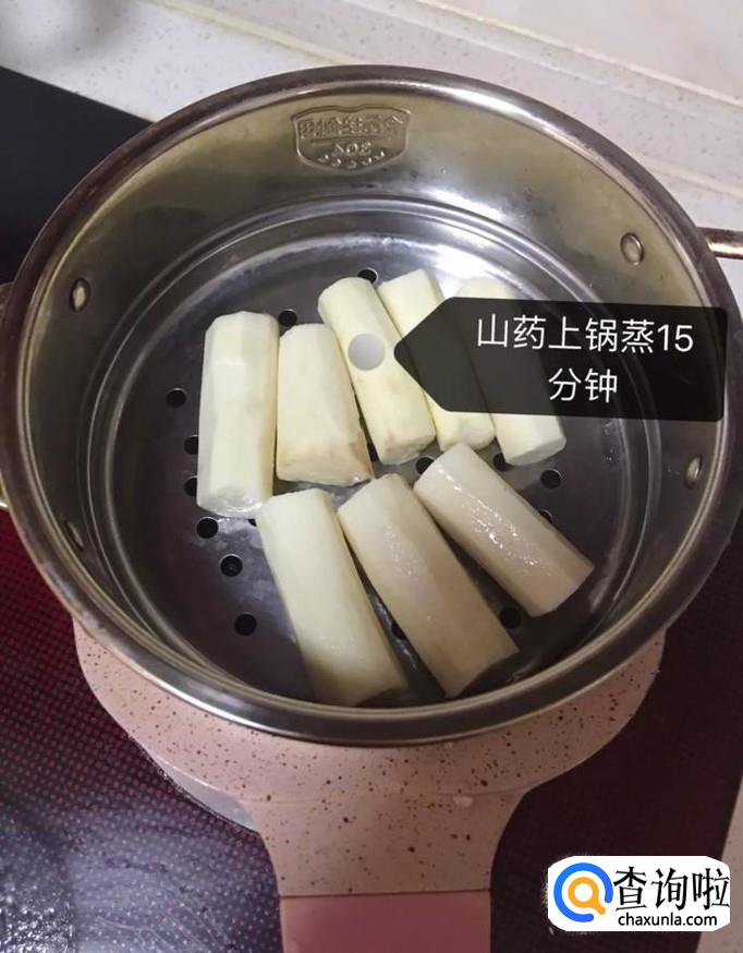 然后将山药去皮切成段,上锅蒸15分钟,如下图所示。