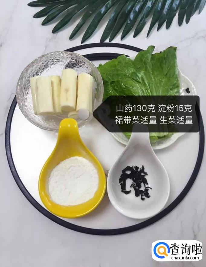 首先准备好所有要用到的食材,如下图所示。小贴士:山药130克,淀粉15克,裙带菜适量,生菜适量。