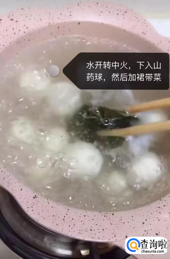 接着往锅中加入适量的清水,待水烧开,转中火下山药丸,然后加裙带菜,如下图所示。