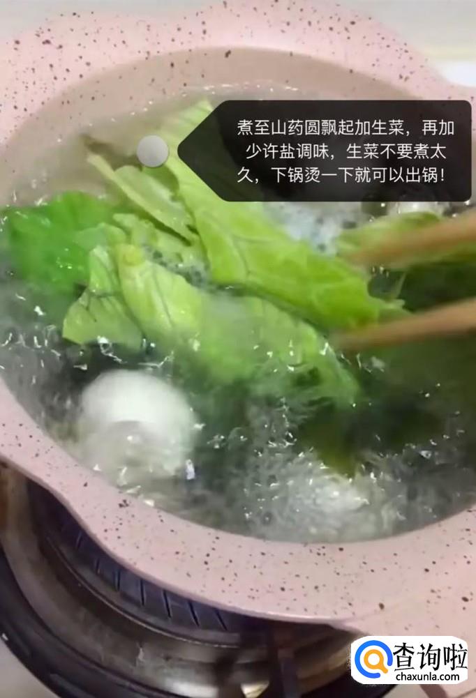 煮到山药丸子浮起来之后,加入生菜,如下图所示。
