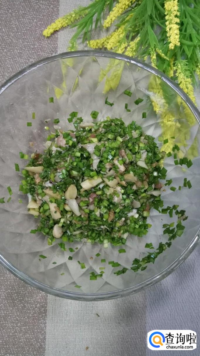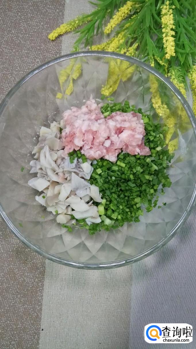 再准备适量韭菜切碎,和焯好的平菇,放一起,再放入适量切成末的五花肉。