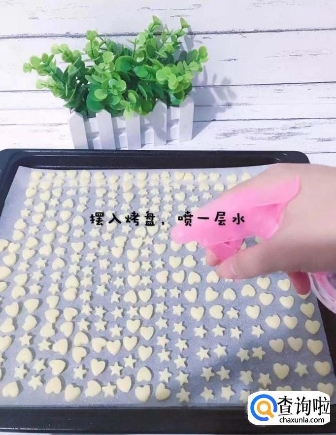 然后把小馒头均匀的摆放在烤盘上并喷上一层水,如下图所示。