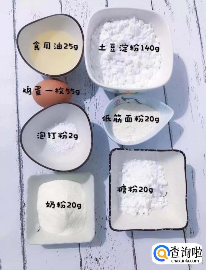 食材:食用油25克,鸡蛋一枚,泡打粉2克,奶粉20克,土豆淀粉140克,低筋面粉20克,糖粉20克。