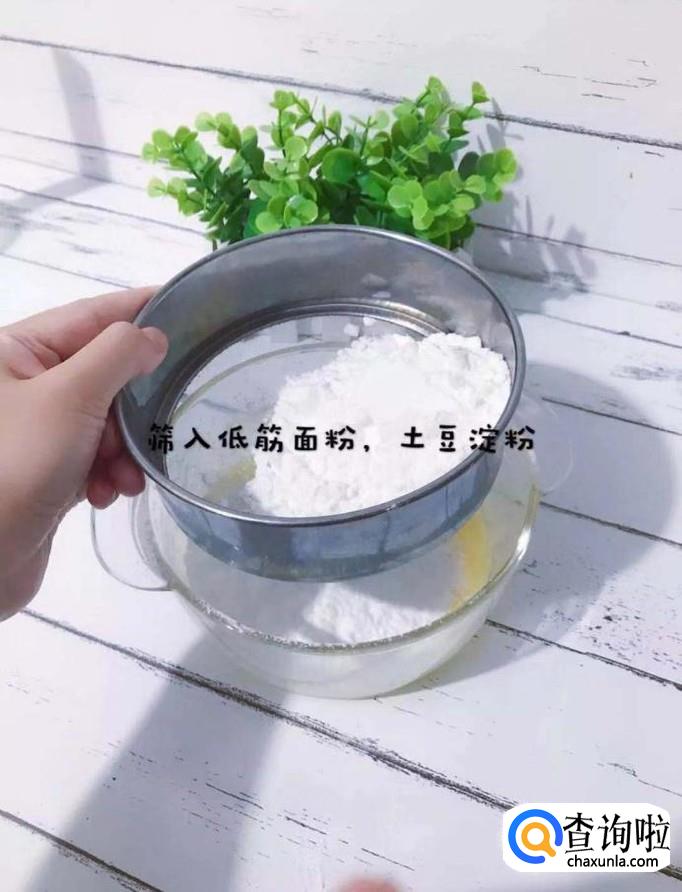 然后向碗中筛入低筋面粉和土豆淀粉,如下图所示。