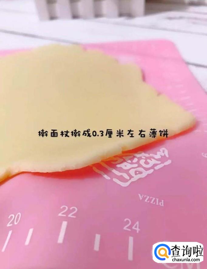 然后用擀面杖把面团擀成3mm左右的薄饼,如下图所示。