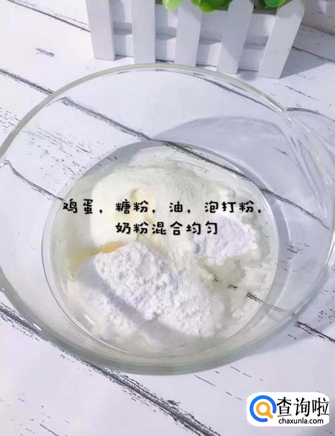 首先将鸡蛋,糖份,油泡打粉,奶粉倒入碗中,混合均匀,如下图所示。