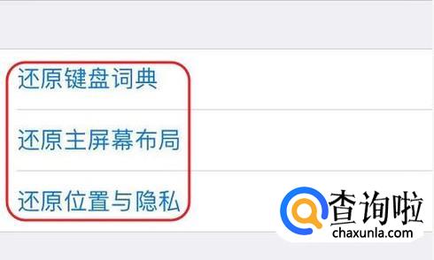 在通用页面的最下方就是“还原”了,点击进入以后我们会发现系统有多种还原设置,比如还原键盘词典、还原位置与隐私;