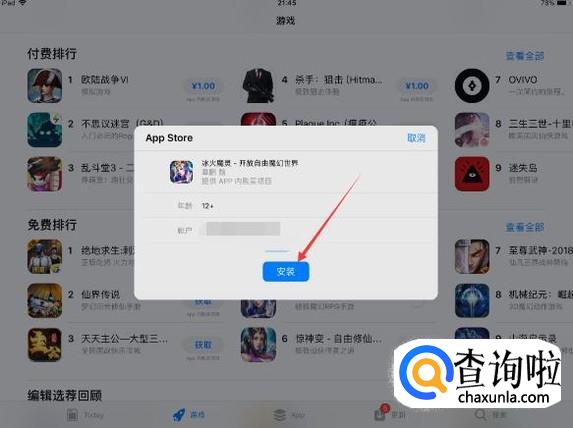 此时会弹出【App Store】对话框,接着再点击【安装】按键,这样我们就成功通过平板电脑下载游戏了。
