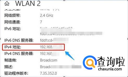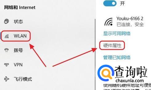接着在弹出的设置对话框,我们以依次点击“WLAN”-“硬件属性”,然后同样可以看到IPv4地址,如图所示...