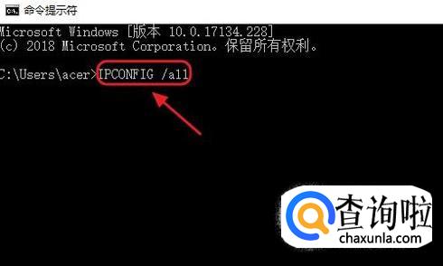 在弹出的命令提示符窗口,我们在光标闪动的位置输入以下命令:IPCONFIG /all,输入以后点击回车键;