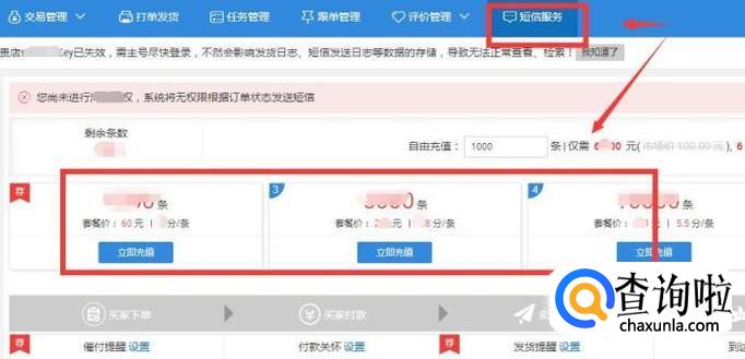 如果想要不定时给顾客发送问候短信,这时可以直接点击的是顶部的“短信服务”选项卡,会打开如下页面,可根据想要购买的需要点击相应的按钮进行购买即可。