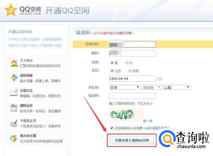 输入完成后点按下方的“开通并进入我的QQ空间”,QQ空间就能成功开启了。