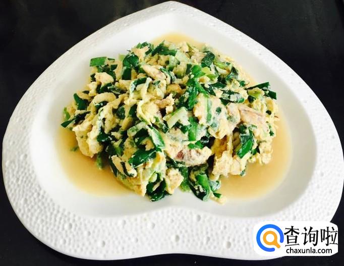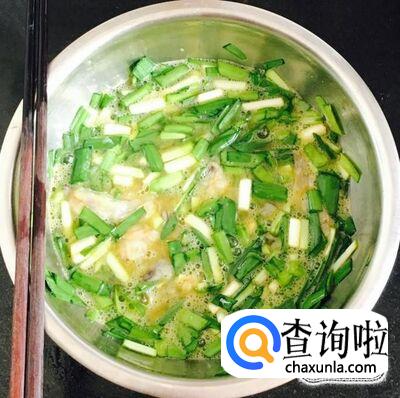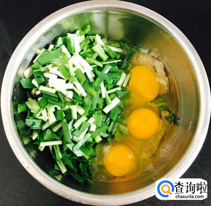 把切好的韭菜段、打三个鸡蛋放入盛皮皮虾肉的容器中