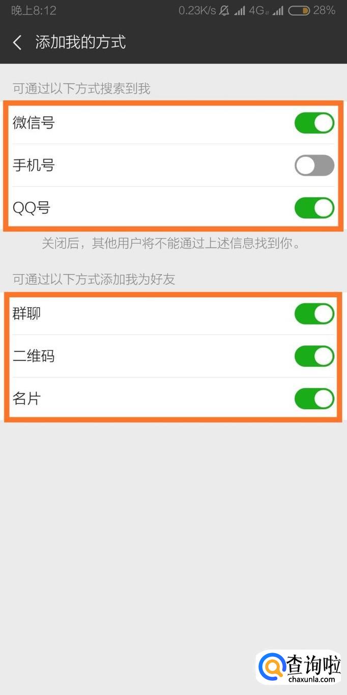 最后关闭“可通过以下方式搜索到我”和“可通过以下方式添加我为好友”下方的所有选项即可。