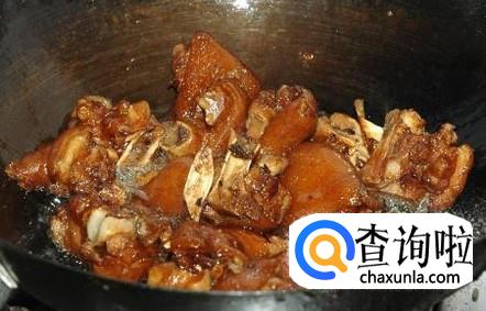 猪脚用炭火燎一燎,将猪脚上的毛烧一烧,也能给猪脚润色。然后将猪脚洗净,洗净后切块(大块才香),然后放到锅里煮,煮到软,但是不烂。