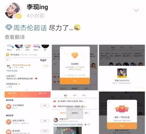 可以看出,在“超话”的竞争中,积分是获胜的有力武器,那么积分是否可以在不同话题间通用呢?答案是肯定的,粉丝在某个超级话题内积攒的积分,完全可以给其他话题进行刷榜。也就是说,你在蔡徐坤的超级话题内频繁发帖、每日签到,别人都确信你是蔡徐坤的超级粉丝,没想到你拿够了积分之后转身就跑去为周杰伦超话打榜,这种现象是可能存在的。