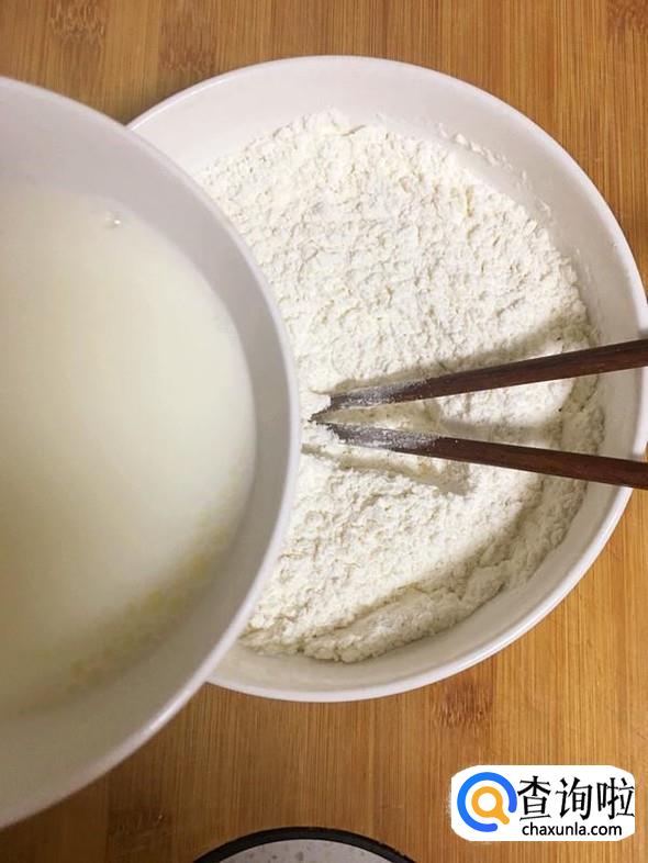 牛奶中加入1小勺白糖,搅拌至溶化后,逐步倒入面粉中。