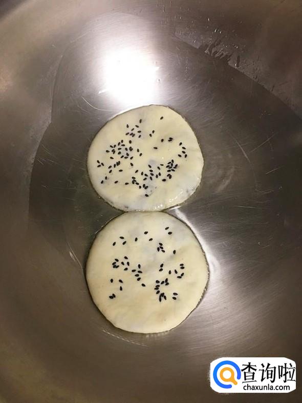 把做好的饼胚放入平底锅,小火煎制。