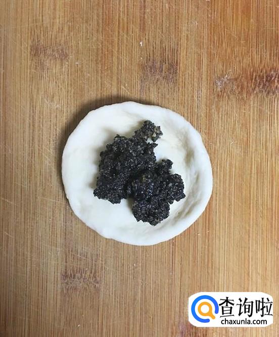 取其中一个小份揉圆后擀成中间稍厚周边比较薄的原片,放上适量芝麻馅。包好后封口朝下,表皮上撒上少许黑芝麻,然后用手掌轻轻按压。