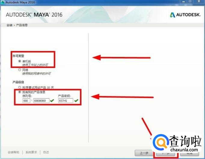 在产品信息中选择“我有我的产品信息”,输入序列号“666-69696969”,“667-98989898”,“400-45454545”,“066-66666666”,输入产品密钥“657H1”后,点击“下一步”