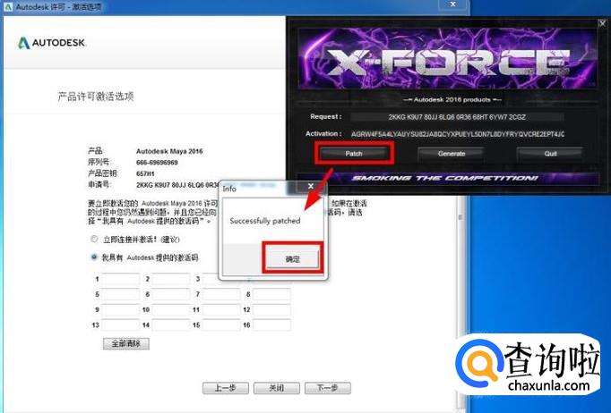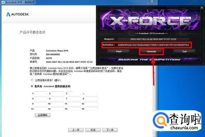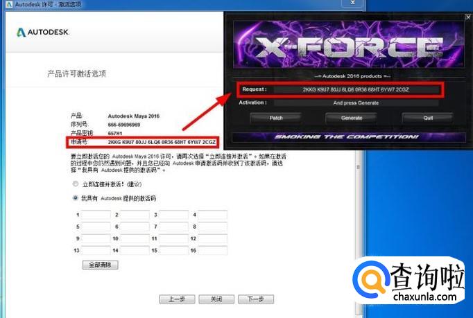 此时运行xf-adsk2016,在Autodesk 许可激活界面将“申请号”复制到“Request”中;