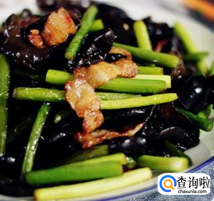 接着在锅中倒入适量的油,烧热后倒入切好的姜蒜末、瘦肉翻炒几下,把备好的蒜台、木耳倒入锅中炒一下,再倒入适量的盐、鸡精、味精翻炒,快要炒熟时倒入葱花翻炒几下即可出锅。