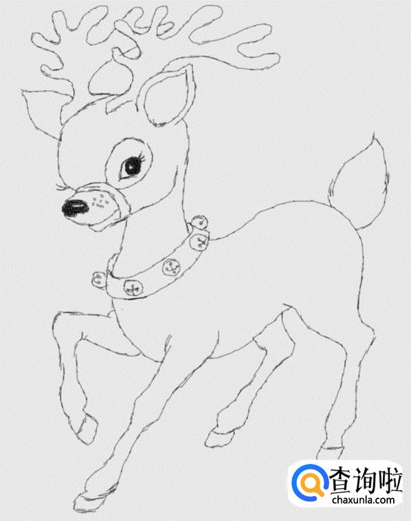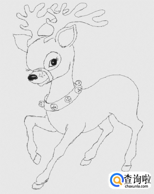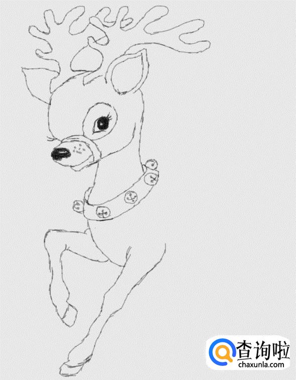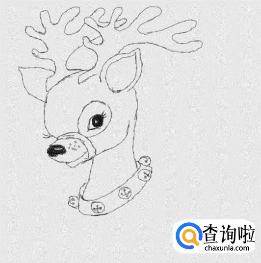 在画好的头部下面画出驯鹿的脖子及脖子上的铃铛,如图所示: