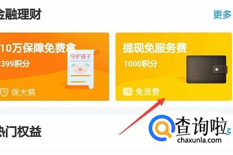 在弹出的蚂蚁会员界面里找到金融理财那一栏,然后可以看到提现免服务费,点击进入页面,可以看到提现额度需要1000积分兑换,点击立即兑换即可,这样我们的过期积分就处理好啦。