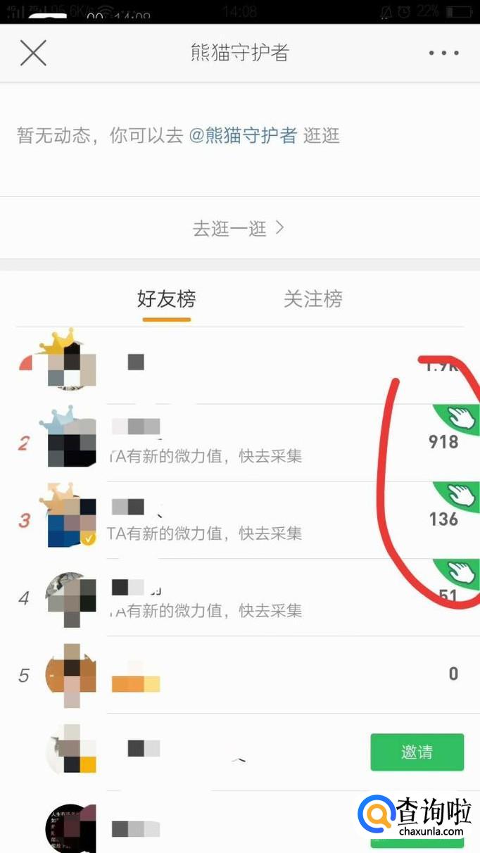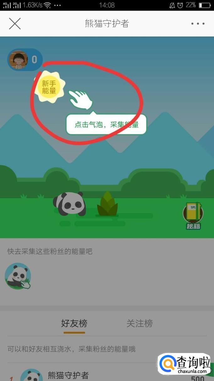 点击好友头像,就可以进入好友的熊猫守护者页面了,然后摘取他们的微力值。