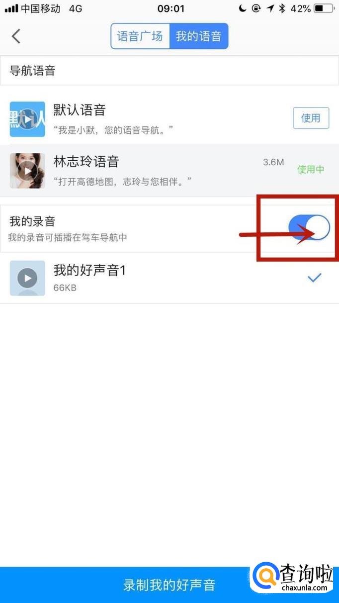 最后点击开启我的录音开关就可以了。这样设置完成,我们下次使用导航的时候就会自动播放我们的声音了。