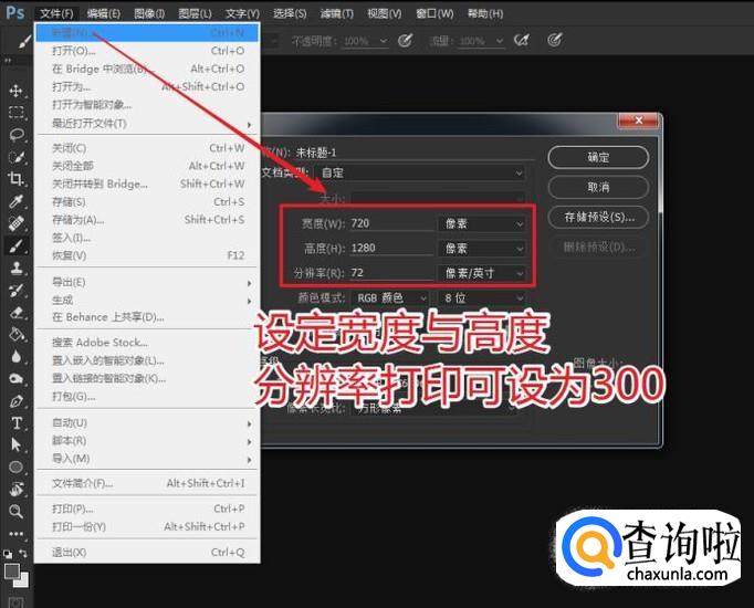 尺寸大小设为:720*1280(分辨率:300像素/英寸)