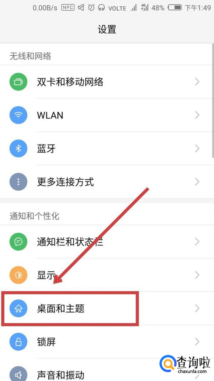 打开【设置】,在【通知和个性化】中找到【桌面和主题】,如图所示。