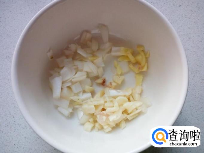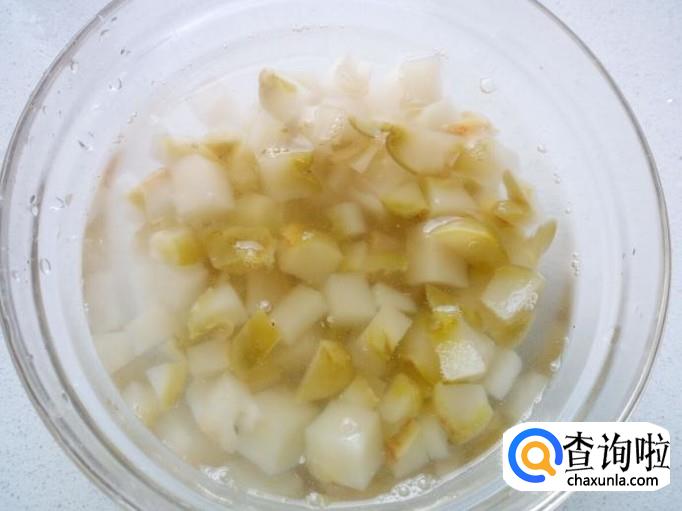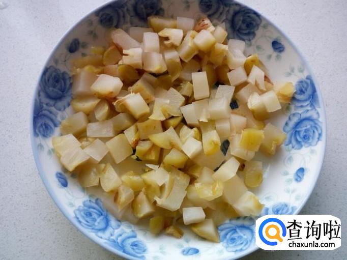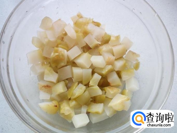 把切成丁的榨菜放入清水中,浸泡一小时(如果喜欢吃咸,就少泡一会)。然后用清水冲洗干净,控干水分。