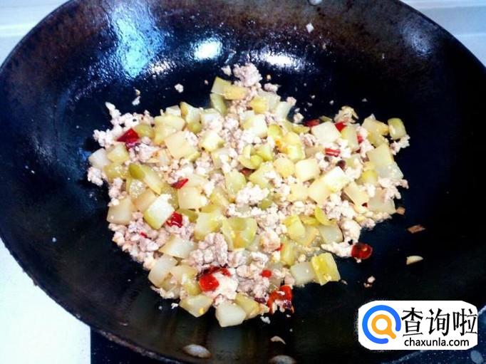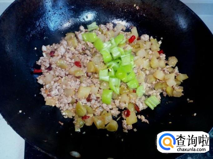 然后放入榨菜转大火翻炒两分钟,放入青尖椒颠勺翻下个。放入味精,关火出勺。